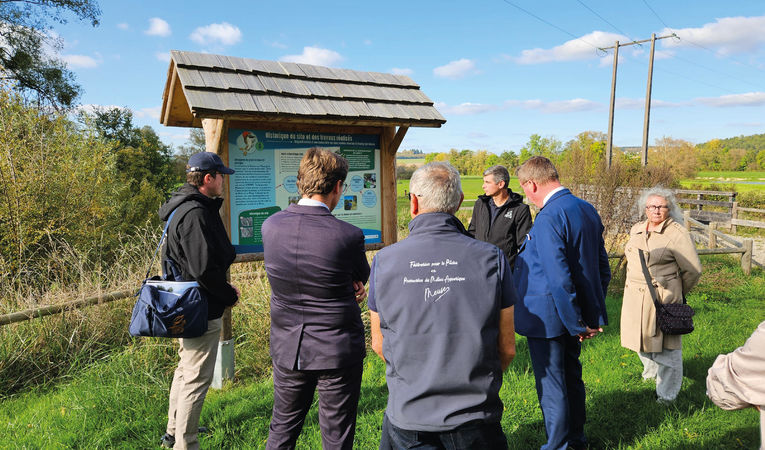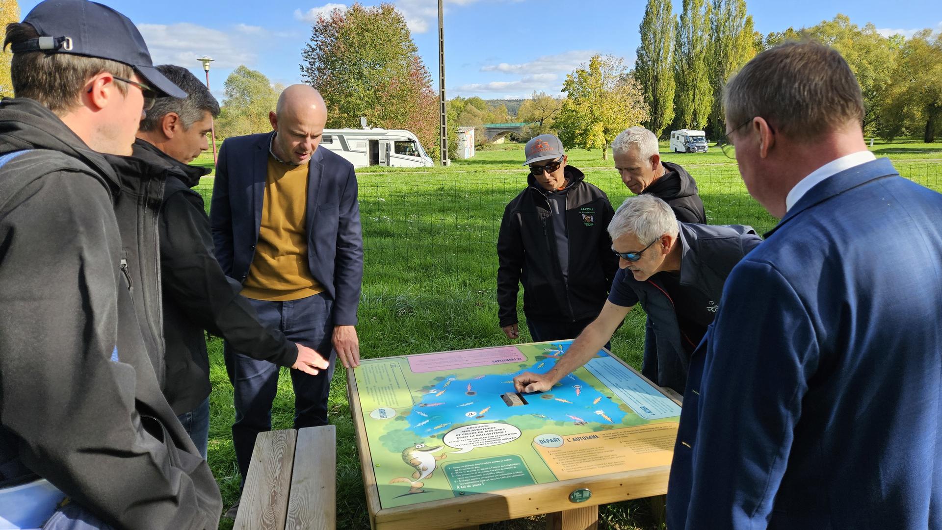 Ce fut l’occasion de présenter les aménagements réalisés autour du site, en mettant en avant les travaux de création du chenal de connexion avec la Meuse et d’une banquette végétalisée, la mise en place d’un sentier pédagogique sur le thème des déplacements des poissons, ainsi que la valorisation des différents suivis écologiques réalisés depuis deux ans.