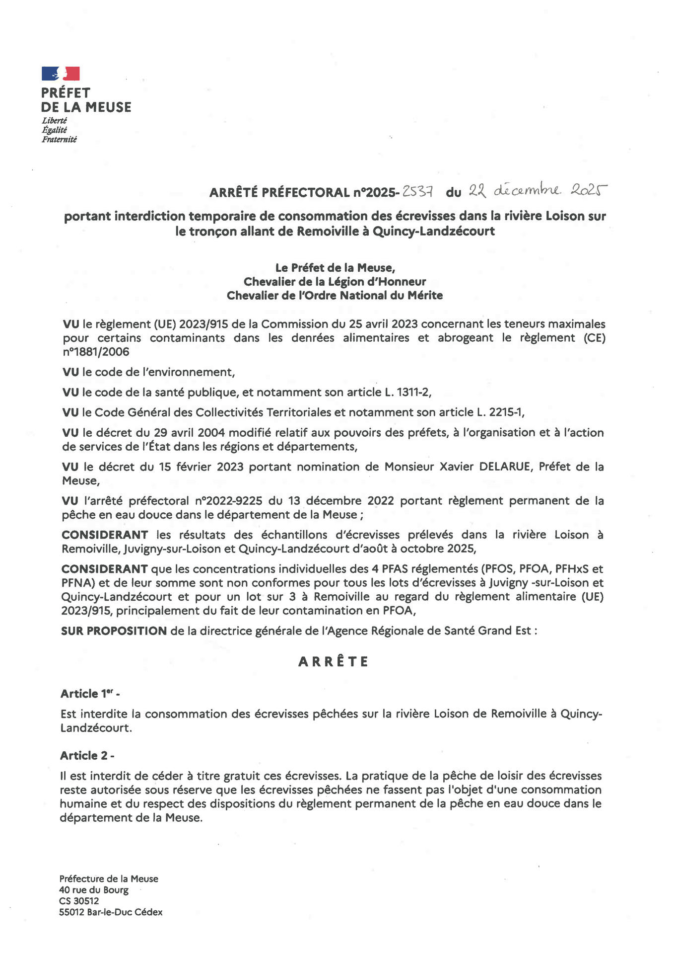 Afin de protéger la santé des pêcheurs et habitants, la consommation des écrevisses provenant du tronçon du Loison entre Remoiville et Quincy-Landzécourt est désormais interdite par arrêté préfectoral.